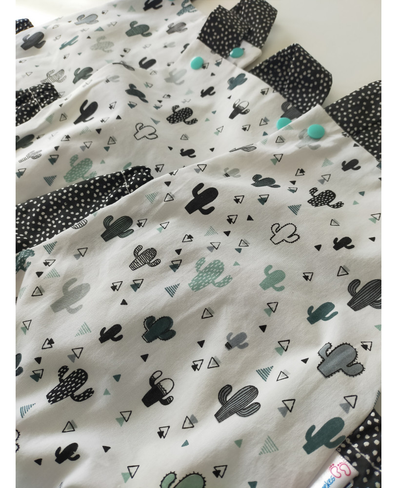 esta realizado en tela de algodón 100% por lo que es ideal para la piel. puedes utilizarlo en pleno verano sin nada más y ponerle una camiseta manga corta, o manga larga según el tiempo. los peques estarán guapísimos.