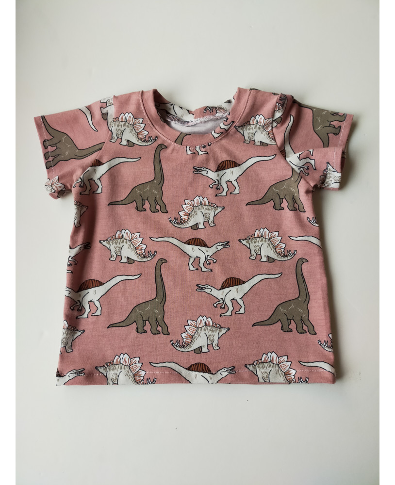 camiseta en estampado de dinos en tono rosa, la tela es organica con certificado GOTS super divertida para el verano.