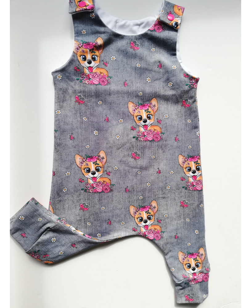peto largo con un divertido estampado y la tela es de FRENCH TERRY (sudadera sin perchar finita) con un estampado digital super divertido que da la impresión a tela tejana. Su composición es de 95% algodón y un 5% de elastan.